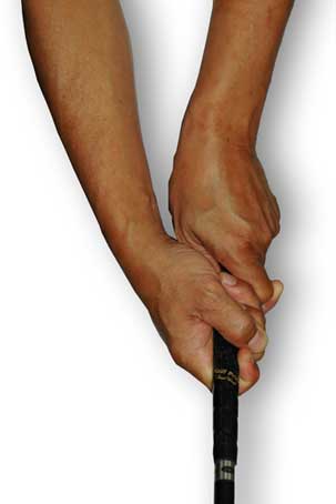 ในทางตรงข้ามการจับกริพแบบสตรองกริพด้วยมือซ้ายที่คว่ำมากจนเห็นข้อนิ้วบนหลังมือ 4 ข้อและมือขวาที่หงายมาก รูปตัว” v ” ชี้ไปที่ด้านนอกไหล่ขวา (รูป 2) จะบังคับให้ขึ้นไม้ด้วยการตวัดหัวไม้ลึกเข้าไปทางด้านหลังมากด้วยหน้าไม้ที่อยู่ในตำแหน่งปิด แขนหนีบติดลำตัวที่จุดสุงสุดและสวิงไม้กลับเข้าหาลูกกอล์ฟในแนวเดิมจากด้านในดันออกด้านนอกเส้นเป้าหมายเข้ากระทบลูกด้วยหน้าไม้ที่อยู่ในตำแหน่งปิด ตีลูกม้วนมุดเข้าด้านซ้าย