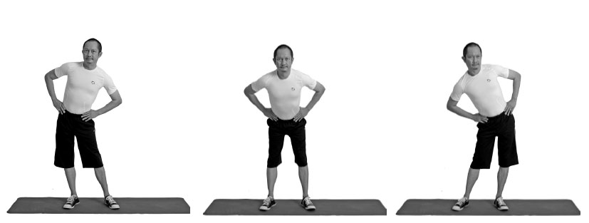 วอร์มอัพสะโพกและลำตัวช่วงกลาง ยืนเท้ากว้างเท่าไหล่ มือเท้าเอว รักษาขาและสะโพกให้ตั้งตรง แล้วหมุนลำตัวช่วงบนทั้งหมดไปทางขวาตามเข็มนาฬิกาเป็นรูปวงกลม 12 รอบ แล้วสลับข้าง