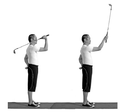 ยืดกล้ามเนื้อต้นแขนด้านหลัง ไหล่และสีข้าง ยืนตัวตรงเท้ากว้างเท่าไหล่ จับไม้กอล์ฟที่สุดปลายทั้งสองข้าง ใช้มือขวาดึงไม้ลงต่ำจนตึง ค้างท่าไว้ 20-45 วินาที แล้วสลับข้าง